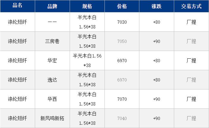 1.4D半光直紡滌綸短纖江浙商談重心7000-7200元/噸出廠或短送,福建7150-7250元/噸附近短送,山東、河北主流7100-7250元/噸送到。