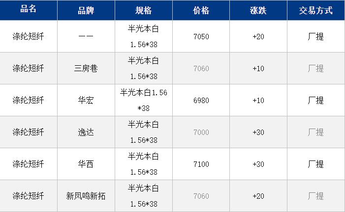 1.4D半光直紡滌綸短纖江浙商談重心7050-7200元/噸出廠或短送,福建7150-7250元/噸附近短送,山東、河北主流7150-7250元/噸送到。