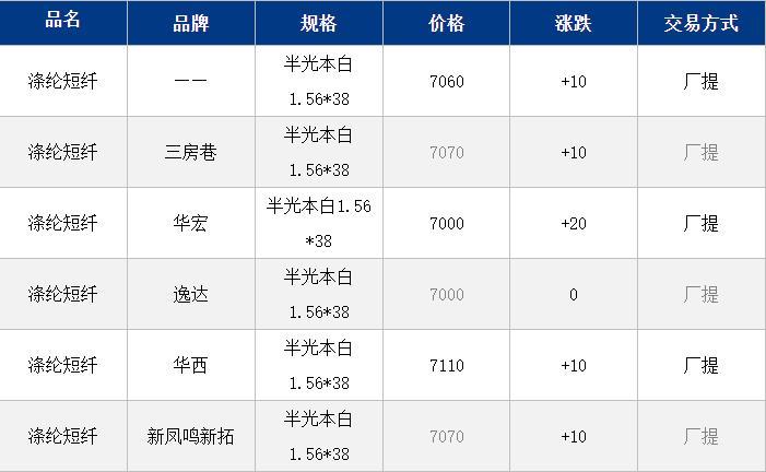 1.4D半光直紡滌綸短纖江浙商談重心7100-7200元/噸出廠或短送,福建7150-7250元/噸附近短送,山東、河北主流7150-7250元/噸送到。