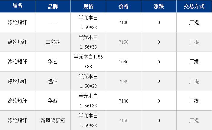 1.4D半光直紡滌綸短纖江浙商談重心7100-7250元/噸出廠或短送,福建7300-7350元/噸附近短送,山東、河北主流7100-7300元/噸送到。