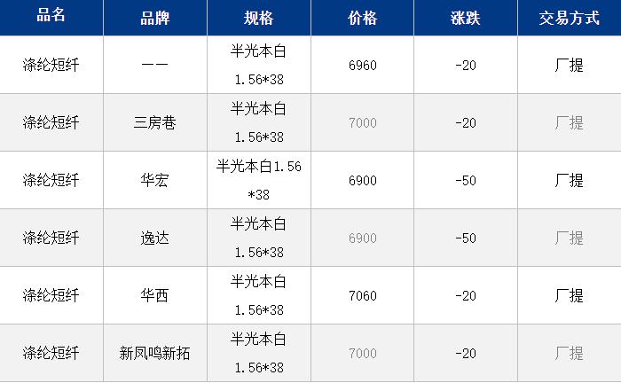 江蘇滌綸短纖現(xiàn)貨價格下跌20元到6960元/噸。原油盤中下跌累及成本,今日短纖期貨盤面弱勢下滑,現(xiàn)貨零星報價,遞盤及成交缺乏。