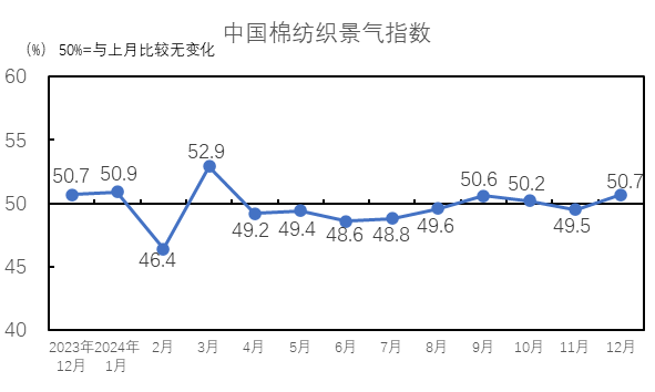 說明:中國棉紡織行業(yè)景氣指數(shù)采集自全國近500家次棉紡織廠,參考國家制造業(yè)PMI等指數(shù)制定方式,通過對多個(gè)主要指標(biāo)加權(quán)計(jì)算得出,當(dāng)指數(shù)高于50,表示棉紡織行業(yè)本月景氣程度好于上月,低于50則表示本月景氣程度不及上月。