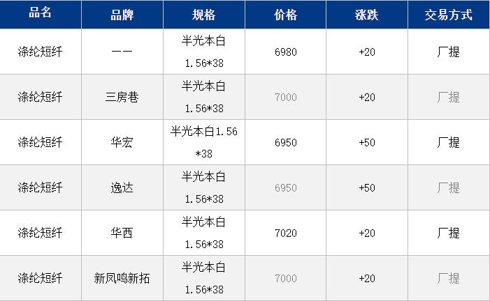 1.4D半光直紡滌綸短纖江浙商談重心7000-7200元/噸出廠或短送,福建7200-7250元/噸附近短送,山東、河北主流7100-7300元/噸送到。