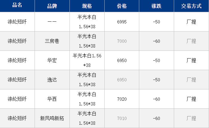 1.4D半光直紡滌綸短纖江浙商談重心7000-7250元/噸出廠或短送,福建7200-7300元/噸附近短送,山東、河北主流7050-7300元/噸送到。