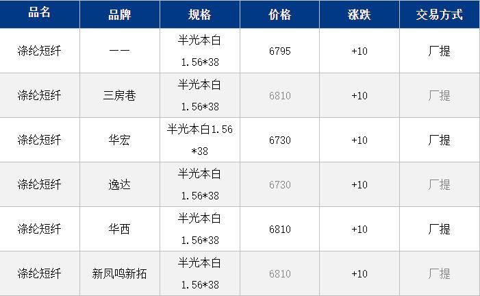 1.4D半光直紡滌綸短纖江浙商談重心6850-6950元/噸出廠或短送,福建6750-6950元/噸附近短送,山東、河北主流6850-7050元/噸送到。
