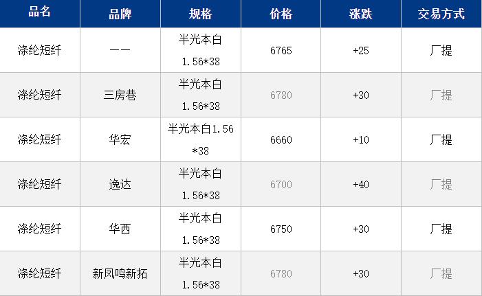 1.4D半光直紡滌綸短纖江浙商談重心6700-6900元/噸出廠或短送,福建6850-6900元/噸附近短送,山東、河北主流6800-7000元/噸送到。