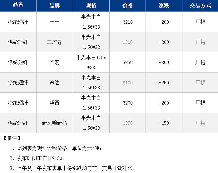 1.4D半光直紡滌綸短纖江浙商談重心6000-6450元/噸出廠或短送,福建6400-6500元/噸附近短送,山東、河北主流6150-6500元/噸送到。