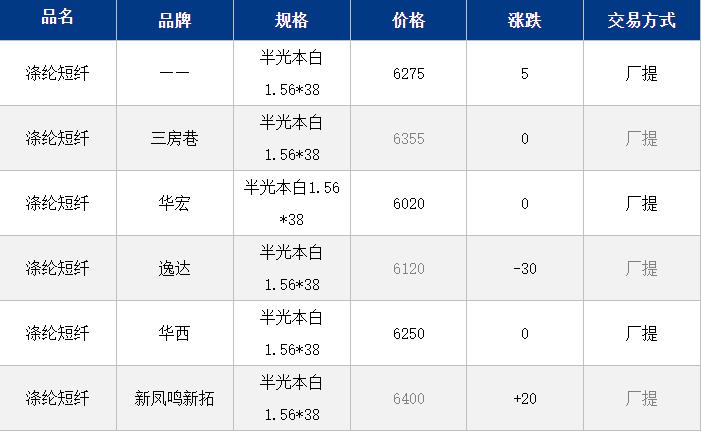 1.4D半光直紡滌綸短纖江浙商談重心6000-6450元/噸出廠或短送,福建6200-6300元/噸附近短送,山東、河北主流6150-6550元/噸送到。