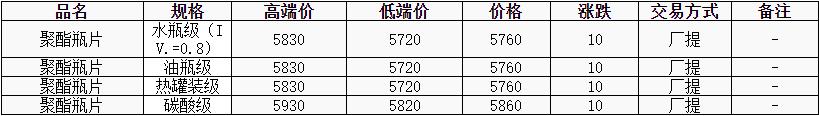 華東聚酯瓶片價格上漲10元至5760元/噸,原料表現(xiàn)強勢,聚酯瓶片工廠報價較上周五多上調(diào)100元/噸,市場重心隨之上揚。下游及貿(mào)易商多謹慎觀望,零星低價遞盤。4-5月貨源報盤5720-5830元/噸,局部略高5880元/噸或期貨合約2506平水;遞盤5725-5740元/噸,交投清淡。