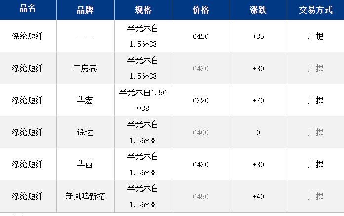 1.4D半光直紡滌綸短纖江浙商談重心6300-6600元/噸出廠或短送,福建6500-6550元/噸附近短送,山東、河北主流6450-6650元/噸送到。