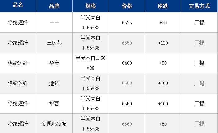 江蘇滌綸短纖現(xiàn)貨價格上漲80元至6525元/噸。關(guān)稅釋放積極信號,短纖工廠報價多普漲100元/噸,現(xiàn)貨價格也跟進(jìn),目前現(xiàn)貨主流價格6520-6600元/噸自提,偏低貨源6400元/噸附近自提。