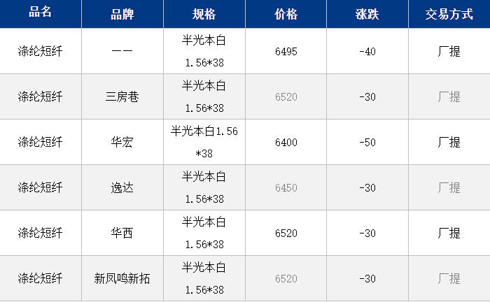 江蘇滌綸短纖現(xiàn)貨價格下跌40元至6495元/噸。下游傳導不暢,短纖市場價格繼續(xù)回落。目前現(xiàn)貨價格主流6490-6520元/噸附近自提,偏低6400元/噸附近。
