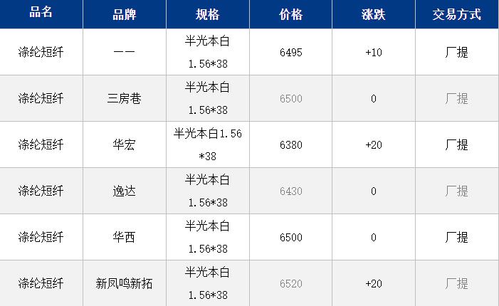 1.4D半光直紡滌綸短纖江浙商談重心6400-6750元/噸出廠或短送,福建主流報6750-6850元/噸現(xiàn)款短送,成交商談6700-6750元/噸現(xiàn)款短送,山東、河北主流6500-6800元/噸送到。