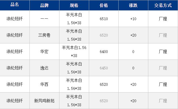 1.4D半光直紡滌綸短纖江浙商談重心6400-6750元/噸出廠或短送,福建主流報6750-6850元/噸現(xiàn)款短送,成交商談6650-6750元/噸現(xiàn)款短送,山東、河北主流6500-6800元/噸送到。