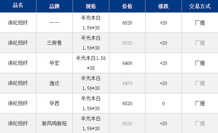 1.4D半光直紡滌綸短纖江浙商談重心6400-6750元/噸出廠或短送,福建主流報6750-6850元/噸現(xiàn)款短送,成交商談6600-6750元/噸現(xiàn)款短送,山東、河北主流6500-6800元/噸送到。