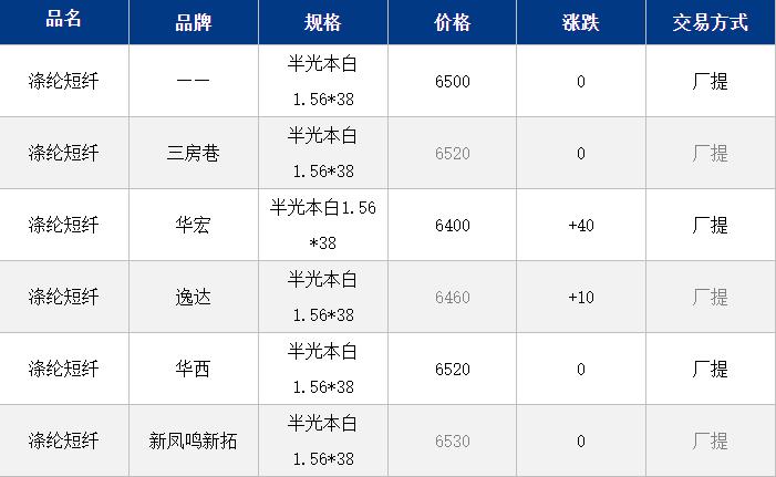 1.4D半光直紡滌綸短纖江浙商談重心6450-6750元/噸出廠或短送,福建主流報6750-6850元/噸現(xiàn)款短送,成交商談6550-6700元/噸現(xiàn)款短送,山東、河北主流6500-6800元/噸送到。