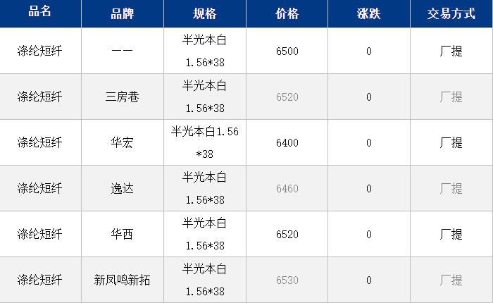1.4D半光直紡滌綸短纖江浙商談重心6400-6700元/噸出廠或短送,福建主流報價6750-6850元/噸現(xiàn)款短送,成交商談6500-6650元/噸現(xiàn)款短送,山東、河北主流6450-6750元/噸送到。