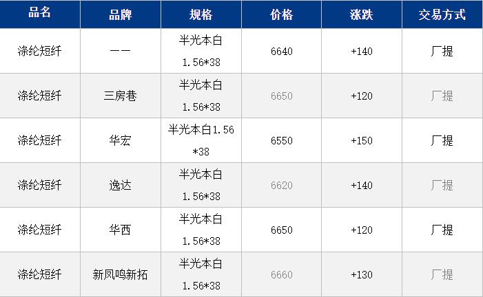 1.4D半光直紡滌綸短纖江浙商談重心6550-6800元/噸出廠或短送,福建主流報(bào)6850-6950元/噸現(xiàn)款短送,成交商談6600-6750元/噸現(xiàn)款短送,山東、河北主流6700-6900元/噸送到。