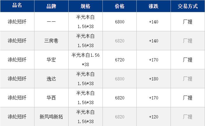 江蘇滌綸短纖現(xiàn)貨價格上漲140元在6800元/噸;成本漲幅較大,低加工費、低庫存及減產(chǎn)、減合約預(yù)期下短纖價格大幅上漲。目前現(xiàn)貨主流6800-6850元/噸自提,偏低6720元/噸附近。