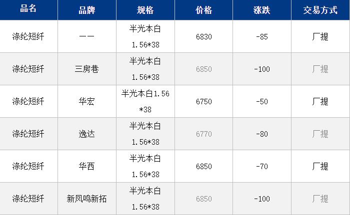 1.4D半光直紡滌綸短纖江浙商談重心6700-7000元/噸出廠或短送,福建主流商談6850-7050元/噸現(xiàn)款短送,山東、河北主流6900-7100元/噸送到。