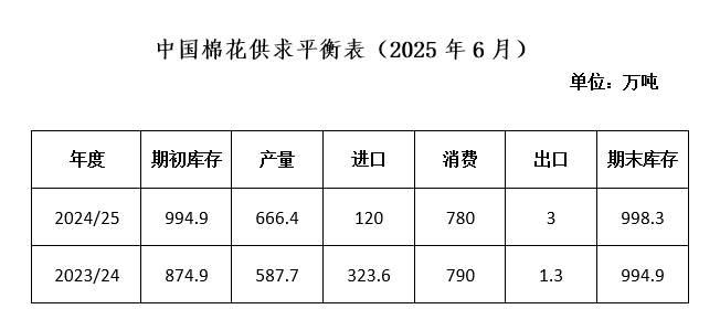 USDA在6月報(bào)告中下調(diào)2024/25年度全球棉花產(chǎn)量和消費(fèi)量。本年度總產(chǎn)預(yù)計(jì)為2611.1萬噸,同比增長(zhǎng)6.2%,;消費(fèi)量預(yù)期為2537.6萬噸,同比增長(zhǎng)1.5%;期末庫存增長(zhǎng)4.8%,達(dá)到1682.8萬噸。
