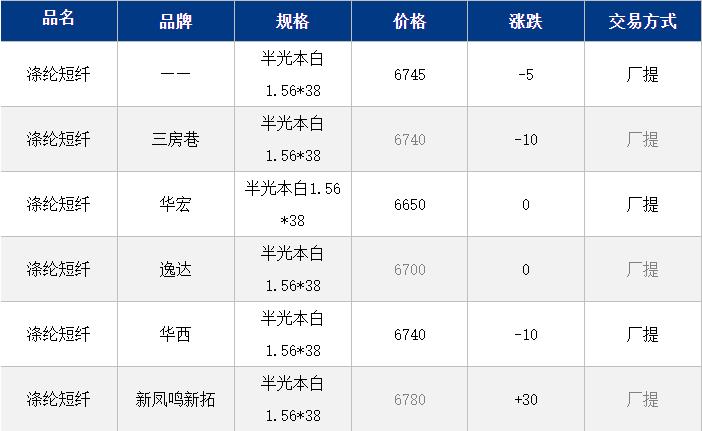 江蘇滌綸短纖現(xiàn)貨價格下跌5元到6745元/噸;目前現(xiàn)貨主流6700-6750元/噸自提,偏低6650元/噸附近,偏高6780-6800元/噸。