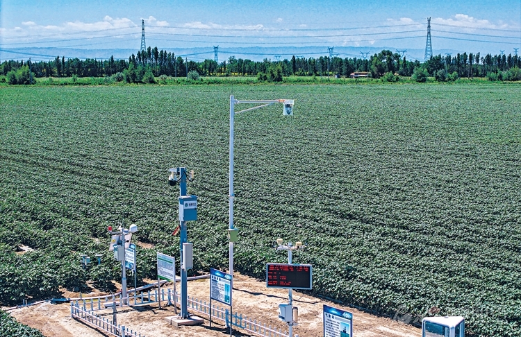 在新疆天業(yè)智慧農(nóng)業(yè)科技有限公司的棉田里,智慧農(nóng)業(yè)管理系統(tǒng)在監(jiān)測(cè)棉田數(shù)據(jù)(6月29日攝)。這套系統(tǒng)可實(shí)時(shí)監(jiān)測(cè)棉田蟲(chóng)情、地下水、氣象等方面數(shù)據(jù),形成數(shù)字化決策,一部手機(jī)就能實(shí)現(xiàn)棉田種植管理。