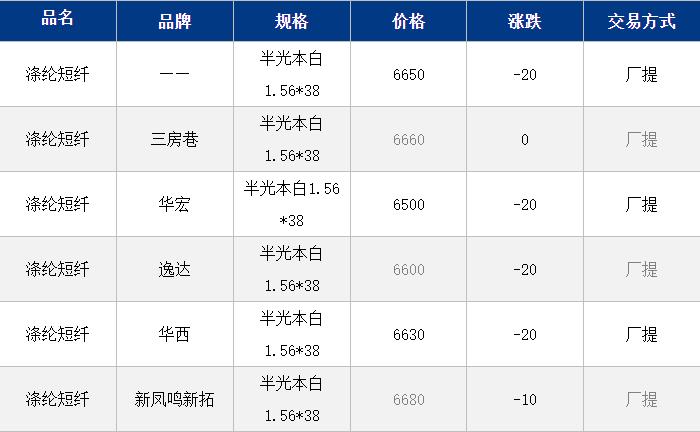 1.4D半光直紡滌綸短纖江浙商談重心6500-6800元/噸出廠或短送,福建主流商談6500-6600元/噸現(xiàn)款短送,山東、河北主流6650-6850元/噸送到。