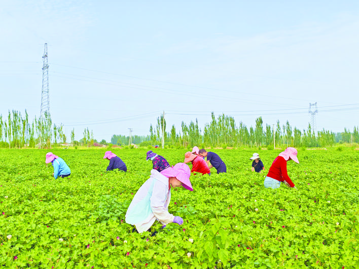 7月15日,在阿瓦提縣阿依巴格鎮(zhèn)玉斯屯克阿依庫勒村棉田里,棉農(nóng)們正在進(jìn)行棉花打頂保鈴。