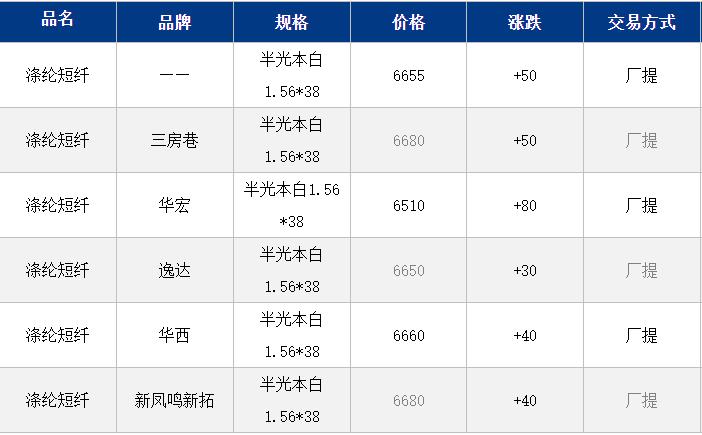 1.4D半光直紡滌綸短纖江浙商談重心6500-6750元/噸出廠或短送,福建主流商談6500-6600元/噸現(xiàn)款短送,山東、河北主流6600-6800元/噸送到。