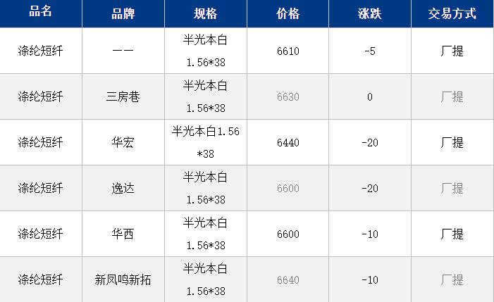 1.4D半光直紡滌綸短纖江浙商談重心6500-6750元/噸出廠或短送,福建主流商談6500-6600元/噸現(xiàn)款短送,山東、河北主流6600-6800元/噸送到。