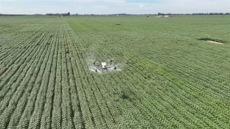 相較人工打頂,多數(shù)棉田采取效率更高的無人機(jī)化學(xué)打頂方式。在老龍河示范基地的棉田,大型飛防無人機(jī)借助北斗導(dǎo)航預(yù)設(shè)路線,在棉田上空來回作業(yè),進(jìn)行化控作業(yè)。每架無人機(jī)1天可以化控作業(yè)700-800畝棉田,能夠在短時(shí)間內(nèi)完成大面積作業(yè),確保打頂藥劑能在棉田中均勻噴灑。孟永明表示,我們用無人機(jī)進(jìn)行棉花打頂,節(jié)省人工成本,同時(shí)也大大提高產(chǎn)量和效率。
