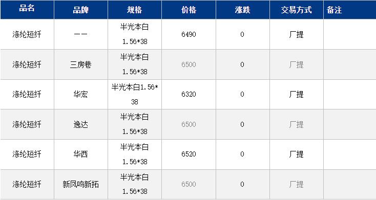 1.4D半光直紡滌綸短纖江浙商談重心6350-6700元/噸出廠或短送,福建主流商談6400-6550元/噸現(xiàn)款短送,山東、河北主流6500-6750元/噸送到。
