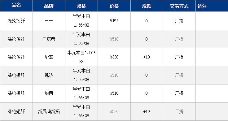 1.4D半光直紡滌綸短纖江浙商談重心6350-6700元/噸出廠或短送,福建主流商談6400-6550元/噸現(xiàn)款短送,山東、河北主流6500-6750元/噸送到。