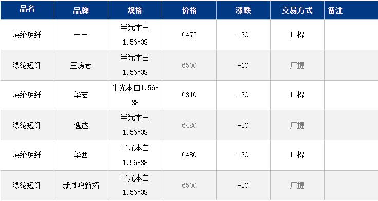 江蘇滌綸短纖現(xiàn)貨價(jià)格下跌20元在6475元/噸。成本偏弱拖累下,短纖期現(xiàn)貨價(jià)格小幅下跌,目前現(xiàn)貨主流6460-6510元/噸自提,偏低6300元/噸附近。