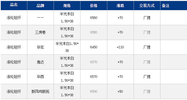 江蘇滌綸短纖現(xiàn)貨價(jià)格上漲70元在6560元/噸。政策及供需利好提振PX11合約大幅上漲,帶動(dòng)PTA及短纖期現(xiàn)貨價(jià)格震蕩上行。目前現(xiàn)貨主流6560-6600元/噸自提,偏低6450元/噸附近;具體成交關(guān)注下午行情匯總。