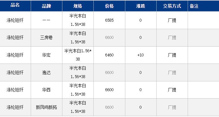 1.4D半光直紡滌綸短纖江浙商談重心6550-6800元/噸出廠或短送,福建主流商談6550-6650元/噸現(xiàn)款短送,山東、河北主流6650-6850元/噸送到。