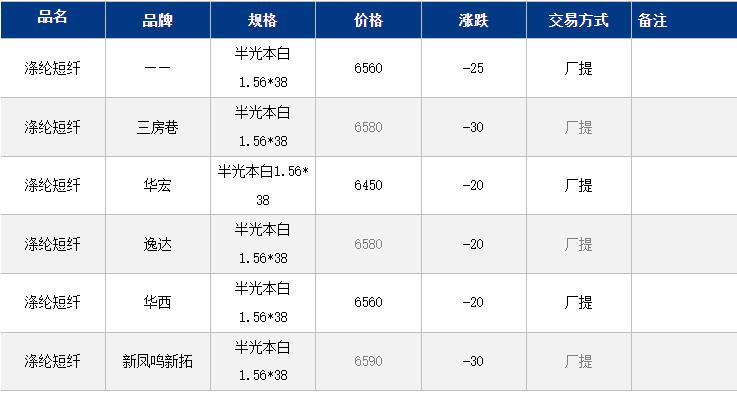 1.4D半光直紡滌綸短纖江浙商談重心6450-6750元/噸出廠或短送,福建主流商談6500-6700元/噸現(xiàn)款短送,山東、河北主流6600-6800元/噸送到。