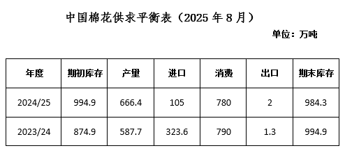 中國棉花協會8月預測,2024/25年度全國棉花消費量780萬噸,同比下降1.3%;進口量105萬噸,同比下降67.6%;產量666.4萬噸,同比增13.4%;期末庫存984.3萬噸,同比下降1.1%。