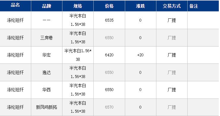 1.4D半光直紡滌綸短纖江浙商談重心6400-6750元/噸出廠或短送,福建主流商談6450-6650元/噸現(xiàn)款短送,山東、河北主流6500-6800元/噸送到。
