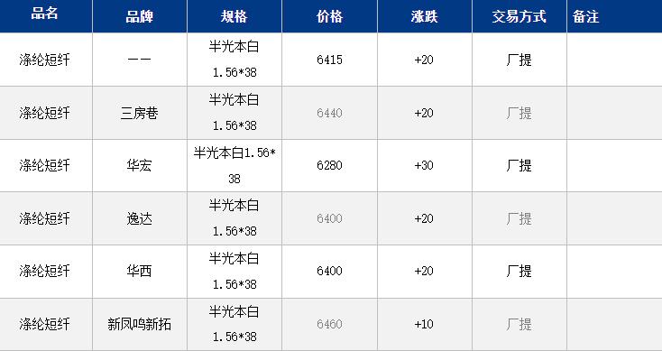 1.4D半光直紡滌綸短纖江浙商談重心6300-6550元/噸出廠或短送,福建主流商談6300-6400元/噸現(xiàn)款短送,山東、河北主流6400-6650元/噸送到。