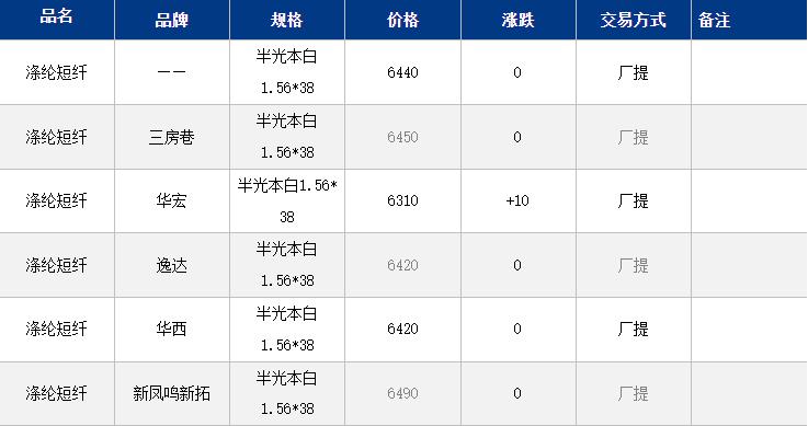 1.4D半光直紡滌綸短纖江浙商談重心6350-6550元/噸出廠或短送,福建主流商談6350-6450元/噸現(xiàn)款短送,山東、河北主流6450-6650元/噸送到。