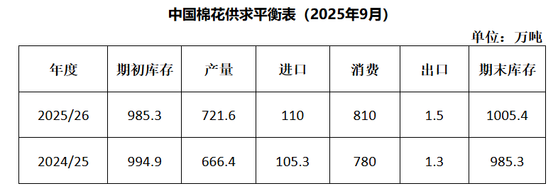USDA在9月報(bào)告中上調(diào)2025/26年度全球棉花產(chǎn)量,消費(fèi)量等,其中中國(guó)產(chǎn)量、消費(fèi)量均上調(diào)。本年度全球總產(chǎn)預(yù)計(jì)為2562.2萬(wàn)噸,同比下降1.3%;消費(fèi)量為2587.2萬(wàn)噸,同比下降0.3%;期末庫(kù)存下降1.2%,至1592.5萬(wàn)噸。