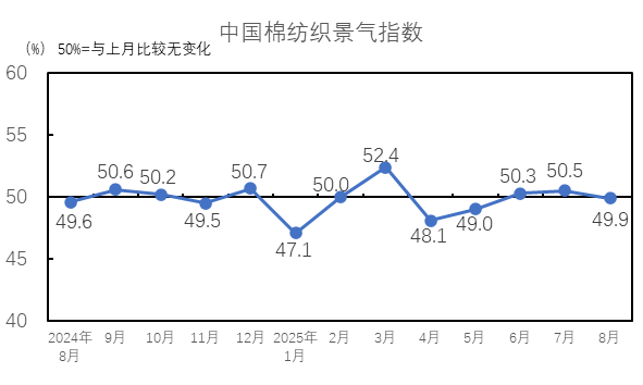 2025年8月,生產(chǎn)指數(shù)為49.9%,低于臨界點,較7月下降0.1個百分點,紡織廠生產(chǎn)較7月下降。從分項指數(shù)看,棉紡織廠設(shè)備開臺率指數(shù)為49.3%,低于臨界點,較7月下降1.1個百分點。紗產(chǎn)量指數(shù)為51.1%,較7月上升1.5個百分點;布產(chǎn)量指數(shù)為49.4%,較7月下降0.2個百分點;紗產(chǎn)量指數(shù)高于臨界點,布產(chǎn)量指數(shù)低于臨界點。