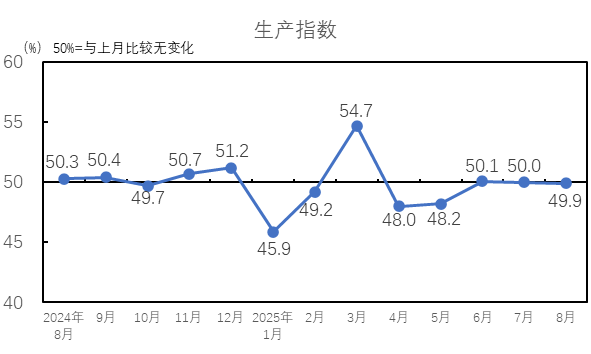 中國制造業(yè)采購經(jīng)理指數(shù)小幅回升。國家統(tǒng)計局服務(wù)業(yè)調(diào)查中心和中國物流與采購聯(lián)合會發(fā)布的2025年8月中國制造業(yè)采購經(jīng)理指數(shù)為49.4%,較上月上升0.7個百分點,景氣水平較上月有所改善。