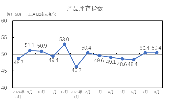 2025年8月,產(chǎn)品庫存指數(shù)為50.4%,高于臨界點,與7月持平,紡織廠產(chǎn)品的庫存量維持上月水平。紗庫存量指數(shù)為50.0%,較7月下降0.7個百分點;布庫存量指數(shù)為51.0%,較7月上升1.0個百分點。紗庫存量指數(shù)處臨界點,布庫存量指數(shù)高于臨界點。