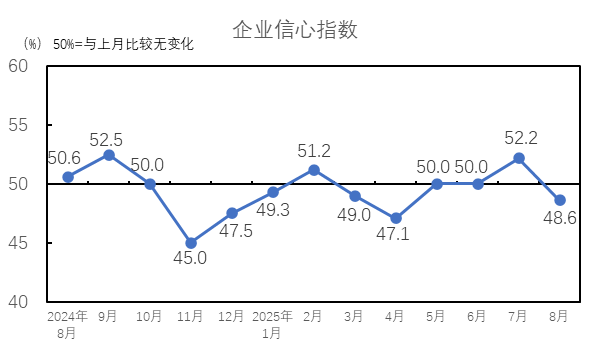 2025年8月,企業(yè)信心指數(shù)為48.6%,較7月下降3.6個百分點,企業(yè)信心指數(shù)低于臨界點,對未來市場的信心下降。8月,隨著傳統(tǒng)旺季的臨近,市場情況得到好轉(zhuǎn),但好轉(zhuǎn)程度有限,未能達(dá)到企業(yè)對傳統(tǒng)旺季的期待,企業(yè)對后續(xù)市場的預(yù)期下降,對未來市場的信心降低。