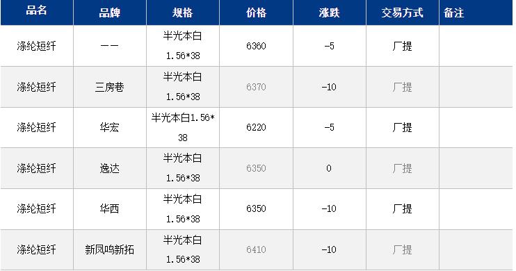 1.4D半光直紡滌綸短纖江浙商談重心6200-6500元/噸出廠或短送,福建主流商談6250-6400元/噸現(xiàn)款短送,山東、河北主流6300-6600元/噸送到。