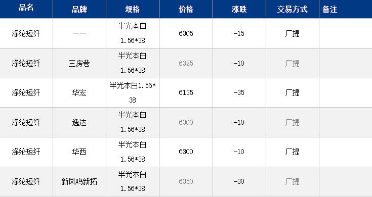 1.4D半光直紡滌綸短纖江浙商談重心6100-6450元/噸出廠或短送,福建主流商談6150-6350元/噸現(xiàn)款短送,山東、河北主流6250-6550元/噸送到。