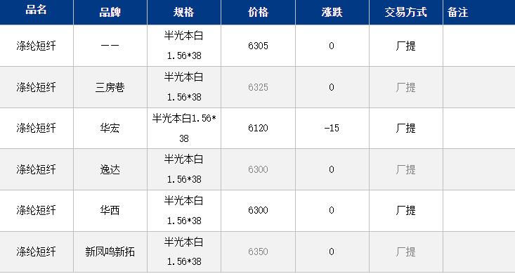 1.4D半光直紡滌綸短纖江浙商談重心6150-6450元/噸出廠或短送,福建主流商談6150-6350元/噸現(xiàn)款短送,山東、河北主流6250-6550元/噸送到。